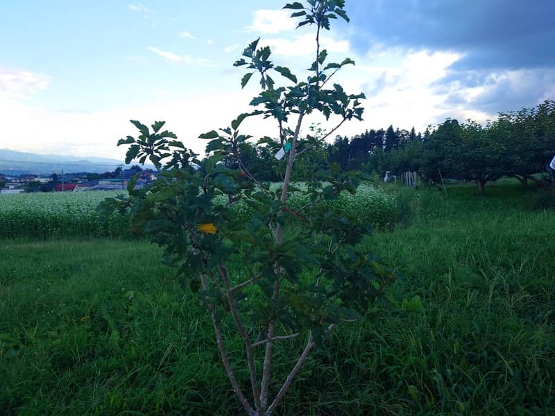 今年植えた新しい山楂子の若木達。まずはこの土地に慣れて貰うことを優先して、春には花芽を摘んでしまっています。 なので、今年は実はならないので、今年は大規模な収穫などもなく、木は青い葉を茂らせています。
